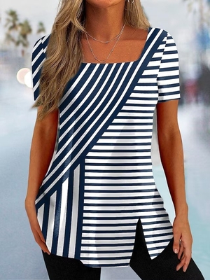 Striped Casual Summer Square Neck No Elasticity Loose Jersey Regular