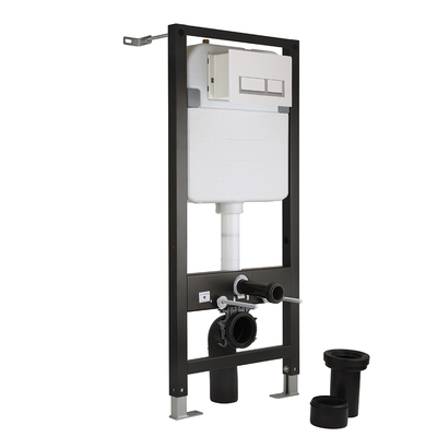 Le bâti support long, complété par un réservoir encastré est la solution sécurisée pour installer votre cuvette suspendue au mur. Avec son réservoir à double chasse d’eau pour économiser l’eau, ce bâti support robuste est compatible avec toutes nos cuvettes suspendues. Il peut être ajusté en hauteur et largeur pour une installation facile. Caractéristiques: Dimensions: l. 50 cm x P 14, 5 cm x H 114 cm Plaque de déclenchement réctangulaire blanche avec bordure argentée Double chasse d’eau 6/3 litres – meilleur pour l’environnement et vos factures d’eau Compatible avec toutes nos cuvettes suspendues La taille peut être ajustée – pour une installation facile Convient à une installation encastrée ou plâtrée Vanne supérieure Poids maximum: 400kg