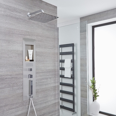 Apportez un style design et élégant à votre salle de bain et profitez d’une expérience de douche luxueuse avec la colonne de douche thermostatique encastrée Llis, fournie avec un pommeau carré de 30 cm et un bras mural. Alliant forme et fonctionnalité, son design encastrable crée un look minimaliste et son espace de rangement intégré vous permet d’y ranger vos articles de toilette. Elle est fabriquée en acier inoxydable de première qualité, et elle comprend une buse hydromassante, des commandes carrées ergonomiques et une douchette avec flexible. Le pommeau diffuse un tomber de l’eau en pluie rafraîchissant. Caractéristiques de la colonne de douche Llis: Dimensions de la colonne: l. 22 cm x H 90 cm Dimensions du pommeau: 30 cm x 30 cm