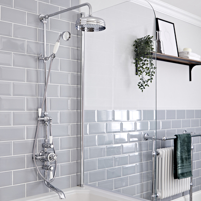 Appportez un style élégant et rétro à votre salle de bain avec la colonne de douche Elizabeth, fournie avec un mitigeur de douche thermostatique exposé à triple fonctions, un bec verseur baignoire, un pommeau et une douchette. Le mitigeur de douche thermostatique permet un contrôle facile du débit et de la température de l’eau et une sécurité anti-brûlures intégrée assure votre confort. Le pommeau rétro offre une grande diffusion d'eau pour une expérience de douche relaxante. Associez cet ensemble à d'autres articles de la collection Elizabeth pour une salle de bain au look parfaitement harmonieux. Caractéristiques de la colonne de douche Elizabeth: Design rétro – parfait pour les salles de bains d’inspiration vintage Pommeau de douche de 19, 4 cm de diamètre en laiton massif et bras mural Comprend une douchette en laiton massif avec poignée en céramique, flexible de 150 cm et douchette Bec verseur baignoire en laiton Finition résistante blanche et chromée Contrôle thermostatique et sécu...