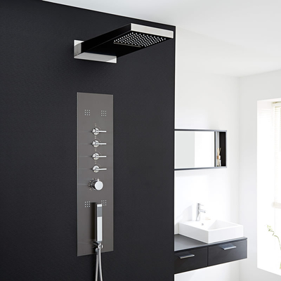 Modèle thermostatique luxueux que cette colonne de douche aux quatre fonctions différenciées pour un bien-être démultiplié dans votre salle de bains. Caractéristiques: Colonne de douche thermostatique à encastrer Acier inoxydable, haut de gamme Finition coloris gris très sombre Pomme haute rectangulaire, fixe, anticalcaire Tomber d'eau: en pluie et cascade Douchette en ABS chromé, anticalcaire Flexible de 1.50m, acier inoxydable chromé 4 Buses hydromassantes, fixes, anti-calcaire Informations relatives au mitigeur thermostatique: Disques en céramique 1/4 de tour (contrôle précis) Sécurité anti-brûlure réglée à 38°C Robinets en laiton massif chromé Simultanéité possible: 1 robinet par fonction Informations supplémentaires: Installation en façade uniquement