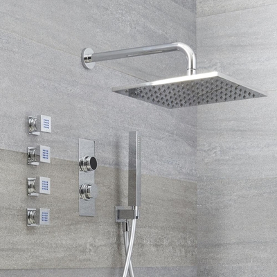 La douche digitale facile à utiliser contrôle la température et permet d'alterner entre les fonctions grâce à son inverseur. Le thermostat a un voyant changeant de couleur pour indiquer la température. Vous l'allumez et l'éteignez par simple pression sur un bouton, et ajustez la température en tournant simplement la commande du thermostat. Un espace disponible dans le plafond ou le mur est nécessaire pour permettre l'installation encastrée du boîtier de commande de la douche. Caractéristiques de la Douche Digitale: Contrôle thermostatique de la température Conception encastrée Plaque de finition fournie Conçue pour l'usage de trois fonctions. Une fonction à la fois. Pas de simultanéité La séquence des fonctions de la douche est programmable Le panneau de contrôle gère la température & l'alimentation en eau par inverseur des fonctions Affichage de la température: voyant indicateur avec changement de couleur selon variation Contrôle thermostatique de +/-2°C y compris en cas de fluctuation de...