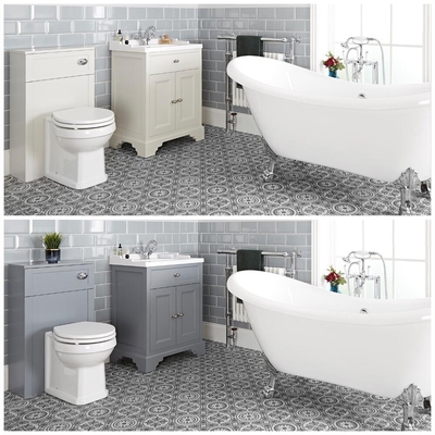 Dimensions WC: l. 36 cm x P 52 cm x H 40 cm Choix de finitions pour les meubles: gris clair et blanc crème Design à poser élégant – parfait pour les salles de bains rétro Rangement pratique et esthétique pour vos articles de toilettes Portes à fermeture douce pour minimiser le bruit Dispose d’une étagère à l’intérieure Façade avec tiroir décoratif Fabriqué en bois d'ingénierie (certifié FSC) durable et résistant à l’humidité Plage de robinetterie non percée – convient à une utilisation avec un choix de robinets divers Cuvette WC en céramique et plan vasque en résine Finition blanche facile à nettoyer Avec trop-plein – vous aurez besoin d’une bonde avec trop plein ou d'une bonde universelle Réservoir à double chasse 4/6 litres – meilleur pour l’environnement et pour vos factures d’eau Abattant fourni Bouton poussoir chromé Qu’est-ce qui est inclus ? Baignoire îlot double dos