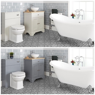 Créez une élégante salle de bain avec l’ensemble de salle de bain Thornton, composé d’une baignoire îlot double dos sabot, d’un meuble sous lavabo avec vasque à poser, d’un meuble WC et d’un WC à poser. Les meubles sont disponibles dans un choix de deux couleurs: gris clair et blanc crème, tandis que les pieds de baignoire sont proposés en deux styles et dans les trois finitions chromée, blanche ou noire – sélectionnez simplement parmi les options déroulantes ci-dessus. La superbe baignoire îlot présente un design à double dos en forme de sabot, vous offrant une expérience de bain luxueuse et relaxante. Sa fabrication solide assure sa durabilité et sa résistance aux rayures et aux taches. Offrant un moyen pratique et élégant pour ranger vos articles de toilette, le meuble sous lavabo est muni d’une vasque à poser pour une touche chic digne des plus grands hôtels, et de portes à fermeture douce pour minimiser le bruit. Fabriqué en céramique de première qualité, le WC affiche un design à poser pour un aspect soigné et une finition blanche émaillée facile à nettoyer. Il est fourni avec un meuble WC, un abattant et un réservoir dissimulé à double chasse économe en eau. Choisissez parmi notre large gamme de robinetterie lavabo et baignoire pour compléter le look harmonieux de votre ensemble pour salle de bain. Caractéristiques de la baignoire îlot Oxford: