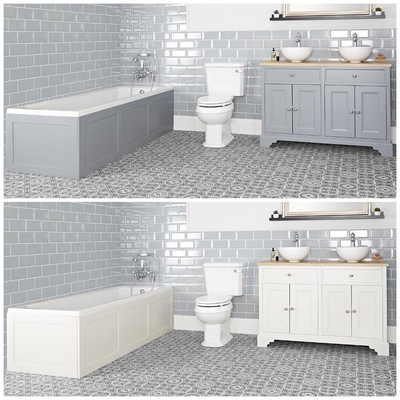 Dimensions WC: l. 47 cm x P 69 cm x H 82 cm Meuble sous lavabo disponible dans un choix de finitions: gris clair et blanc crème Design à poser élégant – parfait pour les salles de bains rétro Rangement pratique et esthétique pour vos articles de toilettes Portes à fermeture douce pour minimiser le bruit Dispose d’une étagère à l’intérieure Façade avec deux tiroirs décoratifs Fabriqué en bois d'ingénierie (certifié FSC) durable et résistant à l’humidité Vasques non percées – conviennent à une utilisation avec les mitigeurs haut ou de la robinetterie murale Vasques à poser et cuvette WC en céramique résistante Finition blanche facile à nettoyer Sans trop-plein – vous aurez besoin de bondes sans trop-plein Réservoir 6 litres avec fixations et poignée chasse d’eau Abattant en bois d'ingénierie blanc à charnières chromées Bouton poussoir chromé Qu’est-ce qui est inclus ? Baignoire rectangulaire