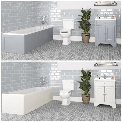 Dimensions WC: l. 47 cm x P 69 cm x H 82 cm Meuble sous lavabo disponible dans un choix de finitions: gris clair et blanc crème Design à poser élégant – parfait pour les salles de bains rétro Rangement pratique et esthétique pour vos articles de toilettes Portes à fermeture douce pour minimiser le bruit Dispose d’une étagère à l’intérieure Façade avec tiroir décoratif Fabriqué en bois d'ingénierie (certifié FSC) durable et résistant à l’humidité Plage de robinetterie non percée – convient à une utilisation avec un choix de robinets divers Vasque en résine durable et cuvette WC en céramique résistante Finition blanche facile à nettoyer Avec trop-plein – vous aurez besoin d’une bonde avec trop plein ou d'une bonde universelle Réservoir 6 litres avec fixations et poignée chasse d’eau Abattant en bois d'ingénierie blanc à charnières chromées Bouton poussoir chromé Qu’est-ce qui est inclus ? Baignoire rectangulaire