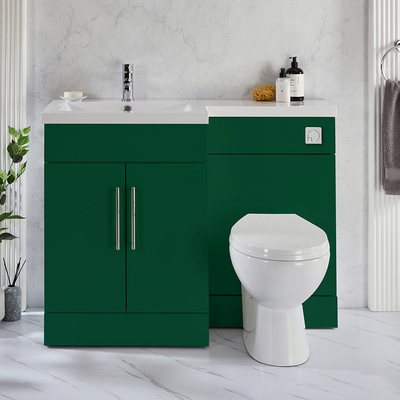 - parfait pour les petits espaces Plan de travail et lavabo en un seul morceau Bois d'ingénierie certifié FSC résistant à l'humidité avec une finition vert foncé Caractéristiques du meuble: Dimensions: l. 60, 5 cm x P 76 cm x H 84 cm Dimensions du lavabo: l. 60, 5 cm x P 46, 5 cm Deux portes à fermeture douce avec poignées barre en T chromées Etagère interne réglable en hauteur Lavabo en résine résistante avec un trou de robinetterie et un trop-plein Assemblage requis Caractéristiques des WC: Dimensions: l. 50 cm x P 24 cm x H 84 cm Projection de la cuvette: 52 cm Cuvette en céramique Réservoir de chasse double 6/3...