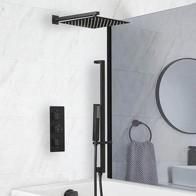 Doté d’une finition noir mat et d’une forme cubique, le kit bain douche Preto donnera du cachet à votre salle de bain. Il se compose d’un mitigeur thermostatique avec inverseur, d’un pommeau de douche carré, d’un vidage-remplissage baignoire et d’un kit douchette sur rampe. Fabriqué en laiton massif durable, ce mitigeur dispose d’une sécurité anti-brûlures qui vous offre une expérience de douche sûre et confortable. Il est muni de commandes carrées, faciles à utiliser, et son design encastré assure un rendu soigné. Cette combinaison de vidage-remplissage et bonde baignoire est conçue pour une installation du trop-plein de votre baignoire. Grâce à ce set, vous n’aurez pas besoin d’une robinetterie sur gorge et vous obtiendrai un aspect ultra-moderne et chic dans votre salle de bain. Le pommeau carré diffuse un tomber d’eau en pluie pour une expérience de douche relaxante et apaisante. La douchette fournit un jet d’eau rafraîchissant, et elle s’ajuste rapidement et facilement à la hauteur...