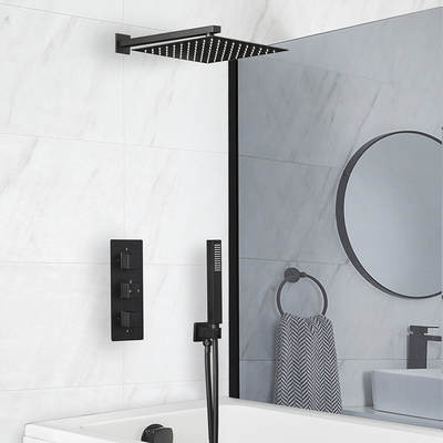 Apportez un style design à votre salle de bain, avec le kit bain douche Preto. Il se compose d’un mitigeur thermostatique avec inverseur, d’un pommeau de douche carré, d’un kit douchette et d’un vidage-remplissage baignoire. Ce mitigeur en laiton massif offre un contrôle facile du débit et de la température de l’eau et il dispose d’une sécurité anti-brûlures qui vous offre une expérience de douche sûre et confortable. D’un design encastré qui assure un rendu soigné, ce mitigeur est doté de commandes carrées, faciles à utiliser. Le pommeau en acier inoxydable diffuse un tomber d’eau en pluie pour une expérience de douche relaxante et apaisante, tandis que la douchette fournit un jet d’eau rafraîchissant. La combinaison de vidage-remplissage et bonde baignoire est conçue pour une installation du trop-plein de votre baignoire. Grâce à ce set, vous n’aurez pas besoin d’une robinetterie sur gorge et vous obtiendrai un aspect ultra-moderne et chic dans votre salle de bain. Ce kit bain douche m...