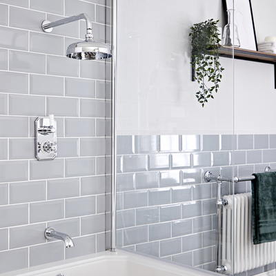 Apportez une touche rétro à votre salle de bain avec l’ensemble douche et baignoire Elizabeth composé d’un mitigeur de douche à double fonctions avec inverseur, d’un pommeau rond de 20 cm de diamètre et d’un bec verseur baignoire. Fabriqué en laiton massif à la finition chromée et céramique, cet ensemble réhaussera le look de votre salle de bain rétro. Le mitigeur à deux fonctions avec inverseur vous permet de changer facilement entre le pommeau et le bec verseur. Il est muni de commandes à levier et en croisillon ergonomiques pour un contrôle facile de la température et du débit d’eau. Il se coupera automatiquement si la température de l’eau dépasse la température de sécurité préréglée, vous assurant ainsi confort, sécurité et aucun risque de brûlures. Profitez d’une expérience de douche luxueuse avec le pommeau de douche rond qui offre un tomber de l’eau en pluie. L'aspect harmonieux est complété par le bec verseur baignoire mural aux courbes lisses. Combinez cet ensemble à d'autres art...