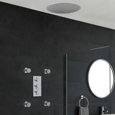 Design résolument moderne, aux jolies lignes arrondies, pour ce très bel ensemble de douche encastrable à deux fonctions, lesquelles peuvent être utilisées au choix, simultanément ou une à une, grâce aux robinets dédiés, pour un espace douche confortable et tendance. Caractéristiques: Pomme de douche ronde de 40cm Installation en plafonnier Accès dans le plafond nécessaire Acier inoxydable chromé Picots caoutchouc anti-calcaire Structure fixe. Non orientable Quatre buses hydromassantes Matériau: Laiton massif chromé Orientables. Anti-calcaire Têtes dévissables pour l'entretien Informations relatives au mitigeur thermostatique: Matériau: laiton massif chromé Deux fonctions Robinet du haut: débit & raccord d'une fonction Robinet du centre: thermostat Robinet du bas: débit & raccord d'une fonction * Doté de disques céramique ¼ de tour (contrôle précis) Sécurité anti-brûlure réglée à 38°C Cartouche homologuée aux spécifications EN1111 Plaque de finition incluse Installatio...