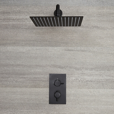 Le mitigeur de douche thermostatique noir Nox et la pomme de douche carrée de 30cm, assortie, apporteront une touche de design tendance dans votre salle de bain. Dotée d’un fini noir mat, la pomme de douche offre un agréable et généreux tomber de l’eau en pluie rafraîchissant. Il est fourni avec un bras en laiton assorti pour l’installation murale. Le mitigeur de douche en laiton massif noir régule à la fois le débit et la température de l'eau. Son contrôle thermostatique vous assure une expérience de douche à la température de votre choix en toute sécurité. Caractéristiques mitigeur: Matériau: laiton massif Finition noire mate Design moderne Conçu pour l’usage d’une fonction Robinet supérieur pour le débit Robinet du bas: contrôle thermostatique Sécurité anti-brûlure Technologie disques céramiques
