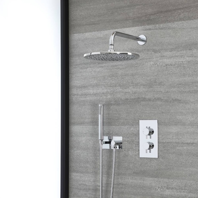 Cet élégant kit de douche à double fonctions Como se compose d’un mitigeur thermostatique avec inverseur, d’un pommeau et d’une douchette. Il offre une expérience de douche relaxante et apaisante. Le mitigeur en laiton massif présente un design encastrable pour un look minimaliste et des commandes rondes ergonomiques pour une utilisation simple. Il dispose d’une sécurité anti-brûlures assurant votre confort et tranquillité d’esprit. Le pommeau en acier inoxydable diffuse un tomber d’eau en pluie, tandis que la douchette crée un jet d’eau rafraîchissant. Cette douchette est fournie avec un flexible de 1m 50 et elle se range dans son support pour un aspect soigné. Associez ce kit de douche à d’autres articles de la collection Como pour un look élégant et harmonieux dans votre salle de bain. Caractéristiques du kit de douche thermostatique Como: Design moderne – parfait pour les salles de bains contemporaines Pommeau rond de 30 cm en acier inoxydable anti-corrosif, avec bras mural Douchette en ABS avec flexible de 1m 50 et support intégré Contrôle thermostatique de la température – sécurité anti-brûlures et protection contre les changements et les fluctuations de température Commandes rondes ergonomiques Mitigeur en laiton massif équipé de disques en céramique pour prévenir les fuites et égouttements Picots en silicone anticalcaires Convient à tous les systèmes de plomberie Pression recommandée: 1 bar Qu’est-ce qui est inclus ? Mitigeur de douche thermostatique avec inverseur