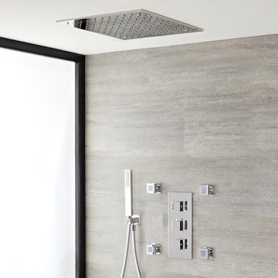 Créez une expérience de douche luxueuse avec le kit de douche thermostatique Kubix, composé d’un mitigeur à triple fonctions avec inverseur, d’un pommeau carré de 40 cm, de quatre buses hydromassantes et d’un kit douchette. La finition chromée accentue le look contemporain et s’harmonise parfaitement avec tout décor de salle de bain. Ses commandes carrées permettent un contrôle facile de la température et du débit d’eau. Fabriqué en laiton massif, il est équipé d’un inverseur qui permet d’alterner entre les fonctions. Il dispose d’une sécurité anti-brûlures et le débit d’eau se coupe si la température dépasse le niveau maximum prédéfini. Vous pouvez profiter d’une expérience de douche relaxante et rafraîchissante grâce au tomber de l’eau en pluie du pommeau en acier inoxydable, au jet d’eau apaisant de la douchette en ABS et à la pulvérisation des buses massantes. L’entretien est facilité par les picots en silicone qui permettent d'éliminer les dépôts du calcaire. Associez ce kit à d’autr...