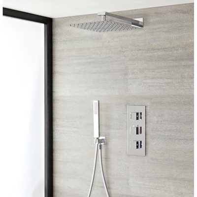 Modernisez votre salle de bain et créez un look design avec le kit de douche thermostatique Kubix, composé d’un mitigeur, d’un pommeau carré de 40 cm et d’une douchette. Le mitigeur thermostatique en laiton massif présente un design encastrable et des commandes carrées élégantes qui permettent un contrôle facile du débit et de la température de l’eau. La sécurité anti-brûlures assure une expérience de douche sûre et confortable.Équipé de picots en silicone, le grand pommeau de douche est facile à nettoyer et sa diffusion d’eau importante vous offre une expérience de douche relaxante et à l’effet bien-être. Associez ce kit à d’autres articles de la gamme Kubix pour une salle de bain au look harmonieux. Caractéristiques de la douche thermostatique Kubix: Design contemporain et finition chromée – parfait pour les salles de bains modernes Pommeau de douche carré, 40 cm, en acier inoxydable avec bras mural en laiton Douchette avec flexible de 1, 75m, raccord coudé et support Contrôle thermostatiqu...