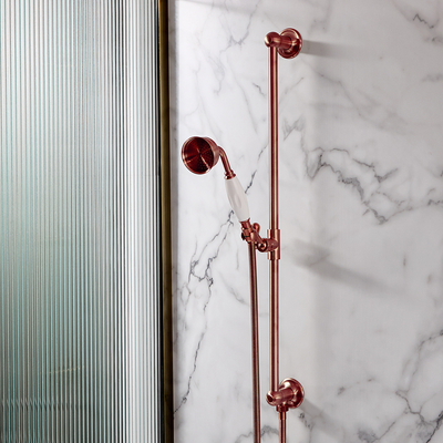 Apportez un aspect élégant à votre salle de bain avec le kit douchette sur rampe Elizabeth, fourni avec une douchette et un flexible. Fabriqué en laiton massif, il est équipé d’un raccord coudé pour un rendu soigné. Il présente un design intemporel et une finition cuivre satiné. La douchette fournit un jet d’eau rafraîchissant et elle s’ajuste facilement à la hauteur souhaitée. Associez-le à un mitigeur de douche Elizabeth et à d’autres articles de cette collection pour un look rétro et harmonieux dans votre salle de bain. Caractéristiques: