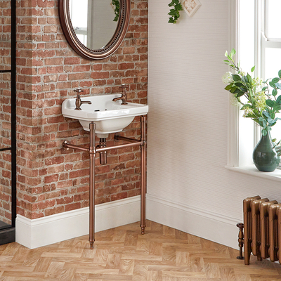 Apportez une touche rétro et élégante à votre salle de bain avec le lavabo sur pieds cuivré de 51, 5 cm Richmond. Ce lavabo est fabriqué en céramique de première qualité à la finition blanche émaillée résistante et facile à nettoyer. Les pieds, quant à eux disposent une finition cuivrée pour un look vintage et sont dotés d’un porte serviettes intégré. Associez-le à d’autres produits de la gamme Richmond pour un fini soigné et harmonieux. Caractéristiques du lavabo sur pieds Richmond: Dimensions: l. 51, 5 cm x P 30 cm x H 86, 5 cm Design rétro pour un look vintage Porte serviettes intégré Pré-percé de deux trous – compatible avec nos paires de robinets lavabo Céramique résistante avec une finition blanche émaillée facile à nettoyer Avec trop-plein – vous aurez besoin d’une bonde avec trop plein ou d'une bonde universelle Pieds en acier inoxydable à finition cuivrée résistante (assemblage requis) Les pieds peuvent nécessiter un raccourcissement