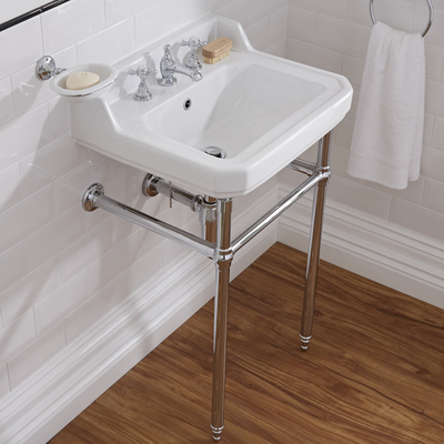 Réalisez une salle de bain rétro très chic grâce à ce lavabo percé de trois trous pour la robinetterie, très pratique avec sa console pour le rangement de vos serviettes de bain, il est aussi fabriqué dans une céramique blanche haut de gamme. Associez-le à d’autres articles de la collection Richmond pour une salle de bain au look élégant et rétro. Caractéristiques du lavabo sur pieds rétro Richmond: Dimensions pieds: l. 56 cm x P 45 cm Lavabo a hauteur confortable