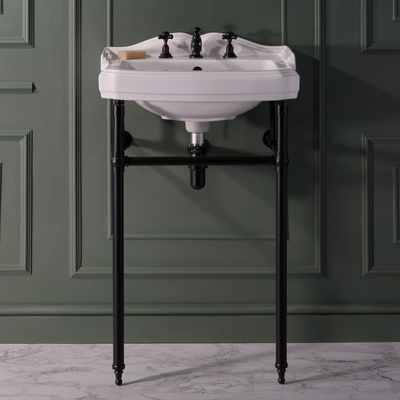 Dimensions: l. 59 cm x P 49, 5 cm x H 89, 5 cm Hauteur confortable Pieds à la finition noir mat Lavabo pré-percé de trois trous pour la robinetterie – convient à une utilisation avec un mélangeur lavabo à 3 trous Design rétro pour un look intemporel et élégant Barre porte-serviettes intégrée Fabriqué en céramique résistante à la finition blanche émaillée facile à ne...