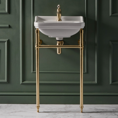 Dimensions: l. 50 cm x P 35 cm x H 89, 5 cm Design rétro pour un look élégant et intemporel Barre porte-serviettes intégré Pré-percé d’un trou pour la robinetterie – convient à une utilisation avec un mitigeur lavabo monotrou Fabriqué en céramique résistante à la finition blanche émaillée, facile à nettoyer Avec trop-plein – vous aurez besoin d’une bonde avec trop-plein ou une bonde universelle Pieds en acier inoxydable à la finition or satiné mat (assemblage nécessaire) Vous aurez également besoin de...