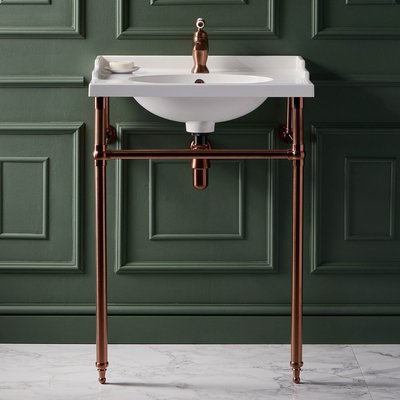 Apportez un style d’inspiration vintage à votre salle de bain avec le lavabo sur pieds Elizabeth. Ce lavabo et ses pieds apporteront du cachet à votre salle de bain. Les pieds sont fabriqués en acier inoxydable durable et sont munis d’un porte-serviettes intégré, vous permettant de disposer de votre serviette toujours à portée de main. Le lavabo en résine résistante présente un design élégant et s’équipe au choix d’un mitigeur pour lavabo monotrou, d’une paire de robinets, de la robinetterie à 3 trous ou d’un robinet mural – qui vous permet de personnaliser son look. Associez-le à d’autres articles de la gamme Elizabeth pour une salle de bain au look parfaitement harmonieux. Caractéristiques: Dimensions: l. 63 cm x P 47 cm x H 89, 5 cm Pieds cuivre satinés Lavabo a hauteur confortable