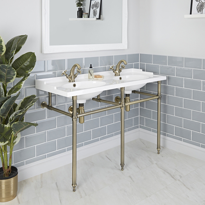 Créez une salle de bain rétro et élégant avec le lavabo sur pieds Elizabeth. Idéal pour créer un style d’inspiration vintage, ce lavabo et ses pieds donneront du cachet à votre salle de bain. Disposant d’une double vasque qui apporte une touche luxueuse et d’un porte-serviettes intégré, votre serviette sera toujours rangée à portée de main. Cette double vasque est fabriquée en résine durable et s’équipe au choix d’un mitigeur pour lavabo monotrou, d’une paire de robinets, de la robinetterie à 3 trous ou d’un robinet mural – qui vous permet de personnaliser son look. Associez ce lavabo sur pieds à d’autres articles de la gamme Elizabeth pour une salle de bain au look parfaitement harmonieux. Caractéristiques du lavabo sur pieds Elizabeth: Dimensions: l. 121 cm x P 47 cm x H 83.5 cm Pieds or brossé Design rétro – pour un look élégant et intemporel Porte-serviettes intégré Plage de robinetterie non percée – convient à une utilisation avec un choix de robinets divers Lavabos en résine résistante...