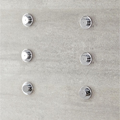 Cet ensemble de six buses de brumisation pour la douche est une alternative et un complément aux buses hydromassantes, dans votre espace douche pour toujours plus de bien-être dans votre salle de bains.6 Jets brumisateur. Matériau: laiton massif. Finition chromé. Brumisation fine. Design rond. Diamètre de 5cm. Facile à installer. Garantie 10 ans.
