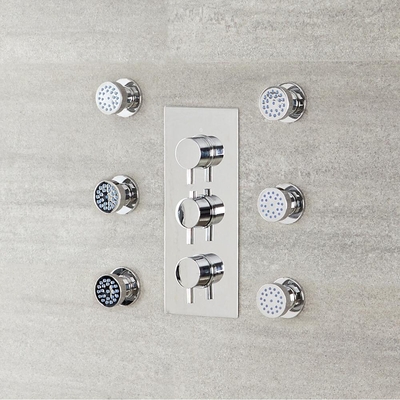 Cet ensemble de six buses de brumisation pour la douche est une alternative et un complément aux buses hydromassantes, dans votre espace douche pour toujours plus de bien-être dans votre salle de bains.6 Jets brumisateur. Matériau: laiton massif. Finition chromé. Brumisation fine. Design rond. Diamètre de 5cm. Facile à installer. Garantie 10 ans. ...