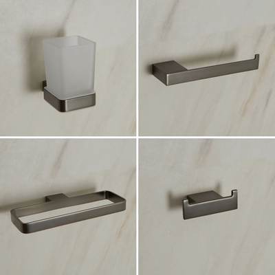 Accentuez le style contemporain de votre salle de bain et créez-y un look harmonieux avec le pack d’accessoires Orno.D’un design moderne, chaque accessoire affiche une finition gris foncé. Cet ensemble se compose d’un dérouleur papier toilette, d’un anneau porte-serviette, d’un porte-gobelet avec un gobelet en verre trempé et d’une patère double porte-peignoir. Associez-le à d’autres articles de la collection Orno pour un look élégant et harmonieux dans votre salle de bain. Caractéristiques du pack d’accessoires 4 pièces Orno: Design contemporain – parfait pour les salles de bains modernes Accessoires assortis pour un look harmonieux Fabriqué en laiton massif à la finition durable gris foncé Gobelet fabriqué en verre trempé incassable Fixations encastrées pour un rendu soigné Qu’est-ce qui est inclus ? Gobelet en verre avec support – Orno Dérouleur papier toilette