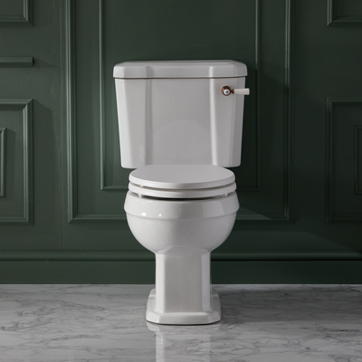 Ajoutez une touche rétro et élégante à votre salle de bain avec le pack WC Richmond comprenant un réservoir et un abattant à fermeture douce. Fabriqué en céramique de première qualité, ce WC à la finition blanche émaillée est résistante et facile à nettoyer. De plus, l’abattant dispose de charnières à fermeture douce. Associez-le à d’autres articles de la collection Richmond pour une salle de bain au look rétro et harmonieux. Caractéristiques: Dimensions: l. 47, 4 cm x P 72, 4 cm x H 82 cm Design rétro pour un look élégant et intemporel Réservoir de 6 litres avec fixations Commande à levier fabriquée en céramique et laiton avec finition cuivre satiné Fabriqué en céramique résistante à la finition blanche émaillée – facile à nettoyer Abattant en bois d’ingénierie finition blanche haut de gamme à fermeture douce – installation simple et rapide Siège à fixation par le haut
