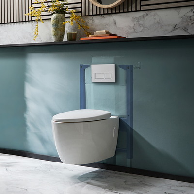 Le pack WC suspendu sans bride Kenton présente un design moderne et compact. Il trouvera parfaitement sa place dans vos toilettes individuelles. Cet ensemble comprend une cuvette WC, un bâti-support bas avec réservoir et une plaque de déclenchement double. Son design mural vous permettra de libérer votre espace au sol et créera un look minimaliste.Découvrez notre collection de lavabos et robinetterie pour compléter votre installation. Caractéristiques: Dimensions cuvette WC: l. 38 cm x P 57 cm x H 34 cm Dimensions bâti-support: l. 50 cm x P 16-19 cm x H 82-102 cm La hauteur et largeur du bâti-support peuvent être ajustées selon vos besoins Plaque de déclenchement rectangulaire blanche Design contemporain suspendu