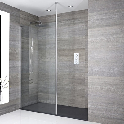 Vous pourrez bâtir votre douche à l'italienne avec cet équipement haut de gamme, composé d'une paroi et d'un bras vertical de renfort, lequel peut être recoupé et de ce receveur de douche dans un marbre reconstitué inaltérable, d'un coloris gris sombre tendance et de fabrication très soignée, pour une salle de bains contemporaine de plein pied. 1 paroi de douche de L. 80 x H. 195cm Verre sécurité transparent de 8mm Traité facile d'entretien Profilés aluminium chromés Ajustables en largeur de 80 à 82.5cm Réversible gauche ou droite au choix * Bras de stabilisation inclus * Recoupable Acier inoxydable chromé Certifié EN14428 et EN12150-2 Garantie 10 ans 1 x barre de stabilisation Matériau: acier Finition: chrome