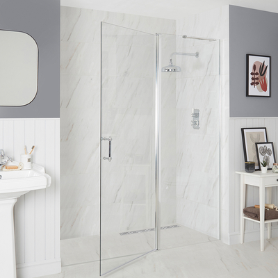 Créez un espace de douche minimaliste d’un style vintage avec la porte de douche pivotante rétro Langley.D’un design épuré sans cadre, qui renforce l’impression d’espace, cette porte est munie d’une poignée rétro chroméee qui ajoute une touche élégante et intemporelle. Durable et robuste, cette porte de douche est faite de verre sécurité de 6 mm. Grâce à sa grande hauteur de 195 cm, elle contiendra un maximum d’éclaboussures.Cette porte pivotante convient à une installation avec l’un de nos receveurs ou caniveaux de douche.Complétez le look et profitez d’une expérience de douche luxueuse en l’associant à l’un de nos kits de douche chromés. Caractéristiques de la porte de douche pivotante Langley: Largeur d’accès: 91, 7 cmVerre trempé de 6mm