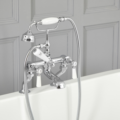 Le robinet bain douche Elizabeth, muni d’une douchette, est parfait pour votre salle de bain rétro. Cet élégant mélangeur est fabriqué en laiton massif, durable et haut de gamme. Sa finition chromée et blanche s’harmonisera avec tous les décors. Il est muni de commandes à levier qui offrent un contrôle facile du débit et de la température de l’eau. De plus, il est équipé de disques céramiques 1/4 de tour qui préviennent les fuites et les égouttements. Créez un look harmonieux dans votre salle de bain en l’associant à d'autres articles chromés et blancs de la collection Elizabeth. Caractéristiques du mélangeur bain douche Elizabeth: Dimensions: L 19, 6 cm x P 17, 6 cm x H 36, 5 cm Design rétro pour un look intemporel et élégant Finition résistante chromée et blanche Fabriqué en laiton massif durable Commandes à levier pour un contrôle facile du débit et de la température de l’eau Commandes et détails en céramique Convient à tous les systèmes de plomberie Disques céramique 1/4 de tour pour prévenir les fuites et les égouttements Raccords filetés 3/4" Pression recommandée: 1, 0 bar Garantie: 10 ans Qu’est-ce qui est inclus ? Douchette avec flexible de 150 cm Vous aurez également besoin de: (voir nos produits auxiliaires) Bonde baignoire