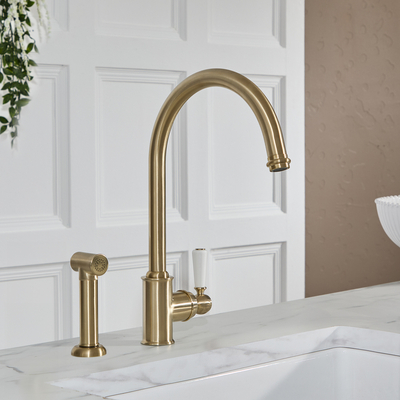 Le mitigeur rétro or satiné Elizabeth viendra ajouter une touche d’élégance intemporelle à votre cuisine. Vendu avec une douchette et fabriqué en laiton massif pour une plus grande durabilité, ce robinet rétro dispose d’une finition or satiné résistante et d’un design classique pour un look luxueux. Sa commande à levier et son bec pivotant permettent un contrôle sans effort de la température et du débit d’eau. Ce robinet dispose également de disques en céramique pour éviter les fuites et les égouttements. Caractéristiques: Dimensions: l. 12, 5 cm x P 25, 9 cm x H 36, 8 cm Design rétro pour un look élégant Finition or satiné résistante Fabriqué en laiton massif pour une plus grande durabilité Commande à levier pour un contrôle facile du débit et de la température de l’eau Bec pivotant Douchette avec flexible de 1, 5m Disques en céramique 1/4 de tour pour prévenir les fuites et les égouttements Raccords flexibles 1/2" avec adaptateur 3/8" Pression recommandée: 2 bar Garantie: 10 ans