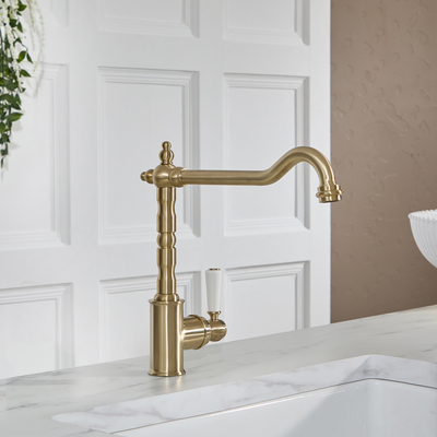 Le mitigeur cuisine rétro Elizabeth, à commande à levier unique et avec bec coudé, viendra ajouter une touche d’élégance intemporelle à votre cuisine. Fabriqué en laiton massif pour une plus grande durabilité, ce mitigeur rétro dispose d’une finition or satiné résistante et d’un design classique pour un look luxueux. Sa commande à levier unique et son bec pivotant permettent un contrôle de la température et du débit d’eau sans effort. Caractéristiques: Dimensions: l. 12, 5 cm x P 31, 3 cm x H 28, 4 cm Design rétro pour un look élégant Finition or satiné résistante Fabriqué en laiton massif pour une plus grande durabilité Commande à levier unique pour un contrôle sans effort Bec pivotant Disques en céramique 1/4 de tour pour prévenir les fuites et les égouttements Raccords flexibles 1/2" avec adaptateur 3/8" Pression recommandée: 1 bar Garantie: 10 ans