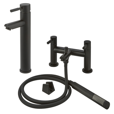 Renovez votre salle de bains et créez un look coordonné avec l'ensemble mitigeur haut de lavabo et mitigeur bain-douche. Le mitigeur de douche et le robinet de lavabo sont dotés d'un élégant design incurvé et de poignées faciles à utiliser. L'ensemble bain-douche comprend la douchette, qui délivre un jet d'eau rafraîchissant et se range sur le support mural lorsqu'elle n'est pas utilisée. Les robinets de lavabo et de baignoire ont été fabriqués en laiton massif pour une sensation de luxe. Caractéristiques: Fabriqué en laiton avec une finition noire résistante Les poignées à levier permettent un contrôle sans effort Avec douchette, flexible et support mural Technologie de disque céramique pour éviter les fuites et les gouttes Robinet de lavabo