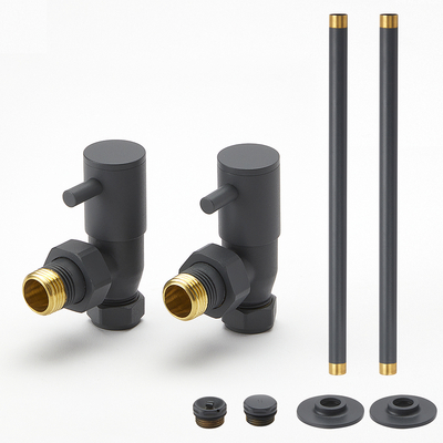 Complétez l’installation de votre nouveau radiateur ou sèche-serviettes avec cette robinetterie de radiateur et ce kit de tuyauterie. Les robinets de radiateur coudés affichent une finition anthracite qui vient accentuer le look contemporain de votre radiateur. Fabriqués en laiton, ils conviennent à une utilisation avec tous nos radiateurs et sèche-serviettes. Les raccords de tuyauterie sont conçus pour raccorder le sol avec l’entrée du robinet, assurant un rendu soigné. Leur finition anthracite s’harmonise parfaitement avec ces robinets de radiateur. Les tuyaux sont dotés d‘une pointe exposée en laiton, ce qui permet de les souder à la tuyauterie de votre radiateur. Caractéristiques du robinet de radiateur et tuyauterie: