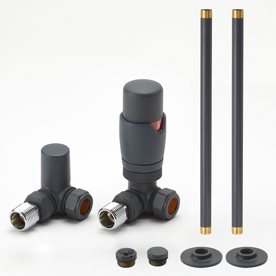 Complétez l’installation de votre nouveau radiateur ou sèche-serviettes avec cette robinetterie de radiateur d’angle et ce kit de tuyauterie. Le robinet thermostatique permet de contrôler facilement la puissance de chauffe d’un radiateur individuel, assurant ainsi un meilleur confort et une consommation d’énergie réduite. Ces robinets de radiateur d’angle affichent une finition anthracite qui vient accentuer le look contemporain de votre radiateur. Fabriqués en laiton, ils conviennent à une utilisation avec tous nos radiateurs et sèche-serviettes. Les raccords de tuyauterie sont conçus pour raccorder le sol avec l’entrée du robinet, assurant un rendu soigné. Leur finition anthracite s’harmonise parfaitement avec ces robinets de radiateur. Les tuyaux sont dotés d‘une pointe exposée en laiton, ce qui permet de les souder à la tuyauterie de votre radiateur. Caractéristiques du robinet de radiateur et tuyauterie:
