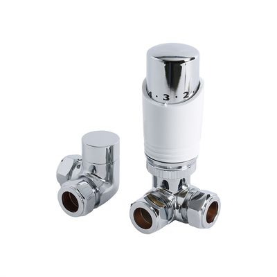 Avec un design épuré et moderne, ces deux robinets de radiateur d'angle s'adaptent à tous les styles de radiateur et sèche-serviettes des habitats contemporains. Ces robinets thermostatiques vous permettent de réduire vos factures d’énergie par un meilleur contrôle de la température qui évite toute consommation d’énergie superflue. Caractéristiques de la paire de robinets de radiateur: 1 tête thermostatique 1 tête simple Matériau: laiton & ABS blanc Finition: chromé Raccord d’entrée de 15 mm pour tuyaux en cuivre Raccord radiateur fileté standard de 1/2’’– convient à tous les radiateurs et sèche-serviettes Garantie: 2 ans