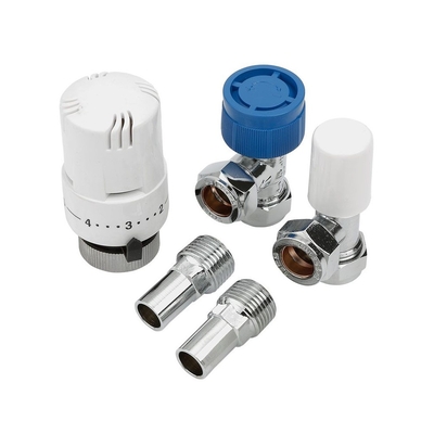 Complétez le look de votre radiateur ou sèche-serviettes avec cette paire de robinets d’angle thermostatiques. Dotés d’une finition blanche élégante, ils s’harmoniseront avec tous les styles. Grâce à leur fonctionnement thermostatique, ils vous permettent un contrôle de la température et de la consommation d’énergie. La tête est fabriquée en plastique de sécurité pour une protection contre la brûlure des mains. Chaque robinet est fabriqué en matériau de qualité, vous assurant de sa résistance. Ces robinets conviennent à une utilisation avec tous nos radiateurs et sèche-serviettes.1 x Paire de robinets de radiateur 1 Robinet d'angle thermostatique 1 tête simple d'angle 1 tête de réglage 1 x jeu de raccords cuivre et laiton Garantie: 2 ans Caractéristiques: Volant en ABS blanc Corps: laiton Dimensions complètes: Schéma sous la photo Informations d'installation: Cette paire de robinets de radiateur thermostatique blanc ajoutera une touche contemporaine à votre sèche-serviette ou radiateur design. Ces robinets thermostatiques vous permettent de réduire vos factures d’énergie par un meilleur contrôle de la température qui évite toute consommation d’énergie superflue. Caractéristiques de la paire de robinets de radiateur :1 Robinet d'angle thermostatique 1 tête simple droite 1 tête de réglage 1 x jeu de raccords cuivre et laiton Volant en ABS blanc Garantie: 2 ans Dimensions complètes: Schéma sous la photo Informations d'installation: Raccord d’entrée de 15 mm pour tuyaux en cuivre Raccord radiateur fileté standard de 1/2’’– convient à tous les radiateurs et sèche-serviettes Adaptation possible aux tuyauteries françaises. Consultez votre plombier Adaptation possible aux tuyauteries françaises. Consultez votre plombier
