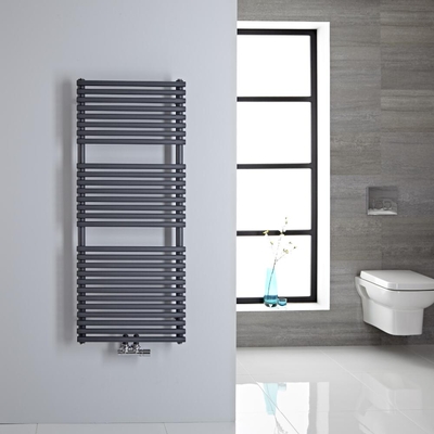 Fabriqué en acier peint anthracite haut de gamme, ce sèche-serviettes de design classique représente une solution de chauffage idéale pour toutes les salles de bain et le plaisir d'avoir à disposition des serviettes éponges toujours agréablement douches et chaudes.Sèche-serviettes H. 121, 5 x L. 50cm.À installer verticalement. Matériau: Acier. Épaisseur 1.5mm. Peint anthracite RAL 7016.À alimenter en eau chaude exclusivement. Projection du mur +/-8cm. Connexions