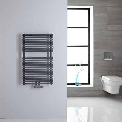 Fabriqué en acier peint anthracite haut de gamme, ce sèche-serviettes de design classique représente une solution de chauffage idéale pour toutes les salles de bain et le plaisir d'avoir à disposition des serviettes éponges toujours agréablement douches et chaudes.Sèche-serviettes H. 80 x L. 50cm.À installer verticalement. Matériau: Acier. Épaisseur 1.5mm. Peint anthracite RAL 7016.À alimenter en eau chaude exclusivement. Projection du mur +/-8cm. Connexions