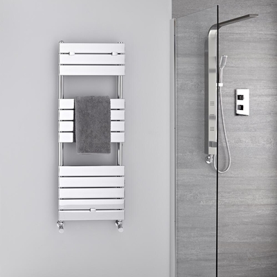 Pour toujours plus de confort dans la salle de bain, vous pourrez opter pour un sèche-serviettes en acier de qualité, à la finition chromée durable, pour à la fois chauffer votre espace et avoir le plaisir de serviettes éponges toujours sèches et douces, sous l'effet de la chaleur dispensée. Sèche-serviettes H. 121.3 x L. 45 x P. 4.5. cm. À installer verticalement. Matériau: Acier. Épaisseur 1.5mm. Finition chromée. À alimenter en eau chaude exclusivement. Projection du mur de 8 à 9.5cm. Du mur aux raccords de 5 à 6.5cm. Entraxe de raccordement +/- 4cm. Diamètres des filetages entrées et sorties 15mm. 374 Watts {{custom Var code=WATTS_TOOLTIP}} Conçu uniquement pour chauffage central. Conforme à la norme EN 442 Pression maximale de service: 10 bars. Fixations fournies. Livré sans robinets. Filetages adaptés aux robinets français. Marquage CE. Poids 13.5kg. Garantie 10 ans.