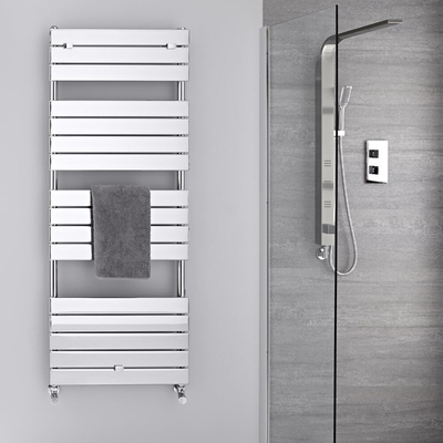Pour toujours plus de confort dans la salle de bain, vous pourrez opter pour un sèche-serviettes en acier de qualité, à la finition chromée durable, pour à la fois chauffer votre espace et avoir le plaisir de serviettes éponges toujours sèches et douces, sous l'effet de la chaleur dispensée. Sèche-serviettes H. 151.2 x L. 60 x P. 4.5. cm. À installer verticalement. Matériau: Acier. Épaisseur 1.5mm. Finition chromée. À alimenter en eau chaude exclusivement. Projection du mur de 8 à 9.5cm. Du mur aux raccords de 5 à 6.5cm. Entraxe de raccordement +/- 5.5cm. Diamètres des filetages entrées et sorties 15mm. 666 Watts {{custom Var code=WATTS_TOOLTIP}} Conçu uniquement pour chauffage central. Conforme à la norme EN 442 Pression maximale de service: 10 bars. Fixations fournies. Livré sans robinets. Filetages adaptés aux robinets français. Marquage CE. Poids 22kg. Garantie 10 ans.