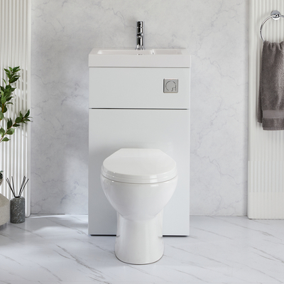 Alliez élégance et fonctionnalité avec le meuble WC et lavabo 2-en-1 Cluo qui conviendra même à la plus petite des suites parentales ou toilettes individuelles. Doté d'une finition blanche brillante et de lignes épurées, l'ensemble combine habilement WC et lavabo en un seul modèle compact pour un gain de place pratique. Le réservoir et la tuyauterie sont bien dissimulés pour un aspect soigné, facilitant aussi le nettoyage et l’entretien. Sa fabrication en bois d'ingénierie le rend durable et résistant à l'humidité. Associez-le à l’un de nos mitigeurs mono lavabo pour un look harmonieux. Caractéristiques du meuble WC avec lave-main Cluo: Dimensions: l. 50, 2 cm x P 87, 6 cm x H 89 cm Design 2 en 1 peu encombrant – idéal pour les toilettes individuelles ou les suites parentales Lavabo pré-percé d'un trou pour la robinetterie – convient pour une utilisation avec un mlitigeur lavabo monotrou Fabriqué en bois d'ingénierie certifié FSC, durable et résistant à l’humidité, à la finition blanche brillante Cuvette WC en céramique et lavabo en résine résistante Abattant à fermeture douce – minimise le bruit et réduit l’usure Avec trop-plein – vous aurez besoin d’une bonde avec trop plein ou d'une bonde universelle Conforme aux normes EN14749 et EN14688 Qu’est-ce qui est inclus ? Meuble WC avec lave-main blanc
