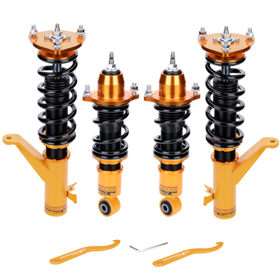 Colour: Golden Features- Able to lower ride height by 1''-3''; allows user to have a more aggressive stance.- Coilovers are 24-way adjustable. Rebound & Dampening adjustment which allows the user the ability to dial in your coilovers to any driving needs. The user can enjoy a comfortable riding experience in all road conditions.- Twin-Tube Shock design is used for low internal frictional resistance in order to increase efficiency & keep shock temps low.- Height adjustment does not sacrifice damper stroke length.- These coilovers are able to have their height adjusted without being taken out of the car.- High Tensile strength performance spring---Tested under a 600, 000 time continuous compression test, the spring distortion was less than 0.04%. Plus, the special surface treatment improves the durability & performance.- Adjustment tools included in the kit. Notice- No instruction included; Professional installation is highly recommended.- Please check our store for other auto parts you may be interested in.- Please feel free to contact us for whatever we can help.