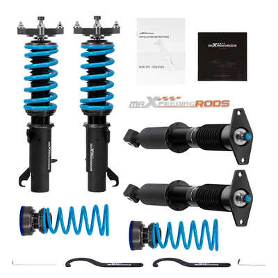 - 3" (depends on vehicle models)which allow lower center of gravity & also add a more aggressive stance 2. Adjustable pre-load spring tension to reduce the shaking motion to a certain extent 3. Adjustable Camber Plate & Pillow ball top mount for sharpening steering response. (for some models)4. 24 levels of adjustable damper -- This allows you the ability to perfectly dial in your coilovers system. For a nice comfortable driving, set damping to full soft. For more spirited driving, set it to 16 clicks. For occasional track days, set it to full stiff.5. CNC machined Aluminum top mounts & lockers--