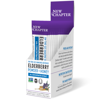 Unleash on-the-go immune defense with quick dissolving Black Elderberry in a convenient powder pack.* Our potent clinically studied Elderberry extract is concentrated 64x for maximum benefit, & naturally sweetened with throat-soothing honey. Just. stir into hot or cold water anywhere, anytime. 64x Concentrated Extract. Portable Immune Support*. New Chapter Elderberry Powder Herbal Supplement (15 Servings).
