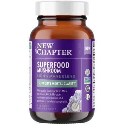 Stay sharp for study, work or play with full-spectrum, organic Superfood Lion 's Mane. Nootropic mushroom blend supports cognition & focus with just 2 capsules daily. Supports Mental Clarity & Normal Brain Function*. Full-Spectrum of Beneficial Compounds from Superfood Mushrooms. New Chapter Superfood Mushroom Lion’s Mane Blend (60 count).